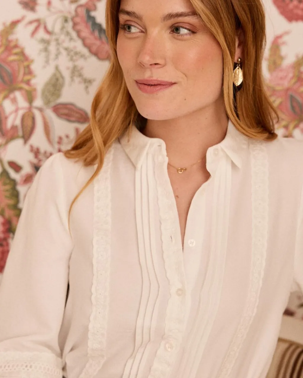 Blouse à manches longues en blanc. Détails en dentelle sur les manches et la poitrine.