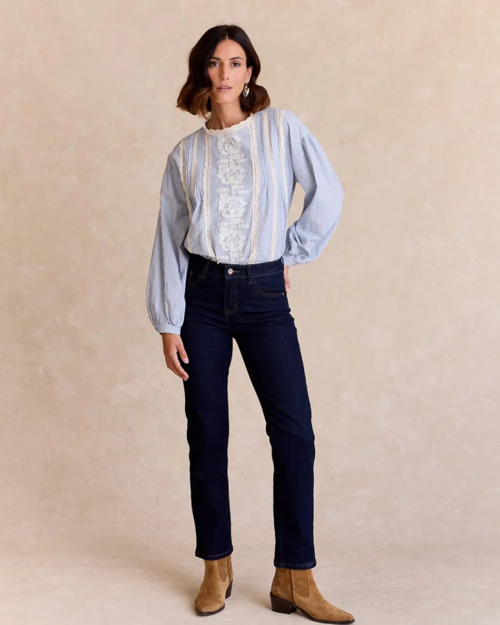 Chemise bleu clair avec détails brodés de couleur brute, avec col rond et fermeture boutonnée sur le devant. Ses manches longues se terminent par un léger poignet, et la broderie délicate ajoute une touche romantique et élégante au vêtement.