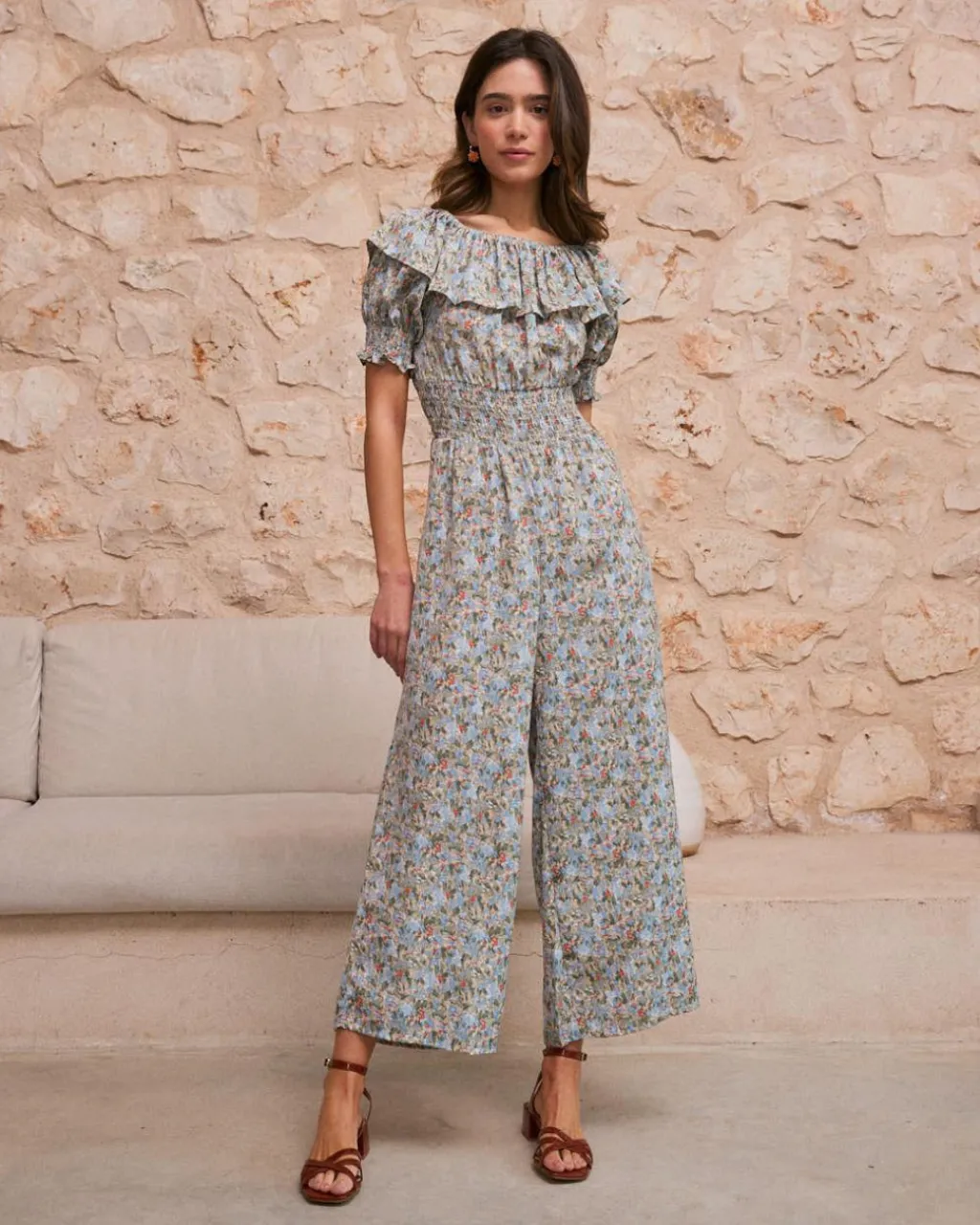 Combinaison bleu indigo avec imprimer floral et décolleté bardot à volants. Sa taille élastique met en valeur la silhouette, tandis que sa coupe fluide apporte confort et mouvement.