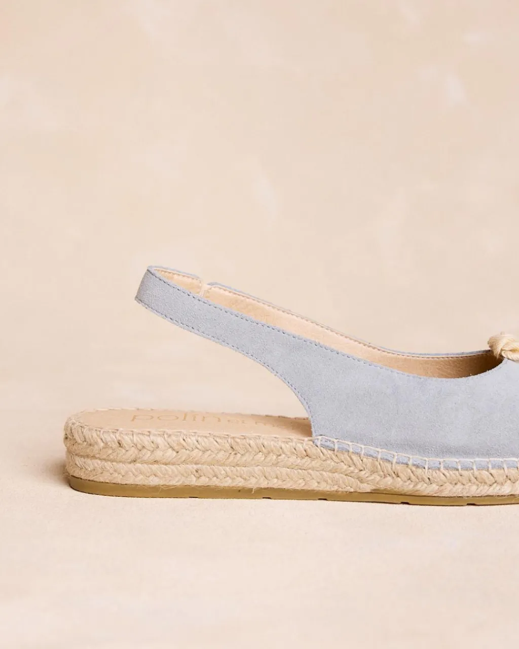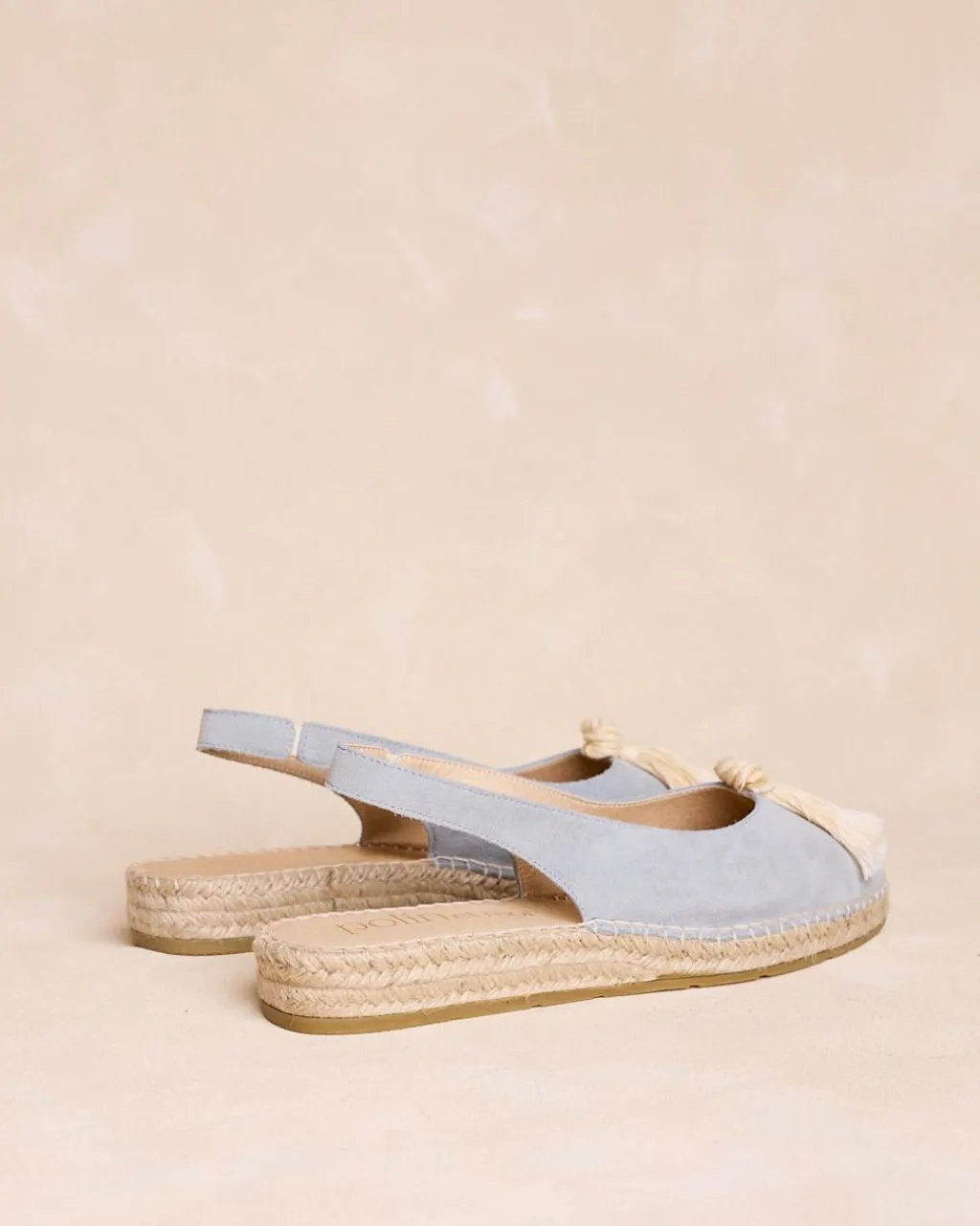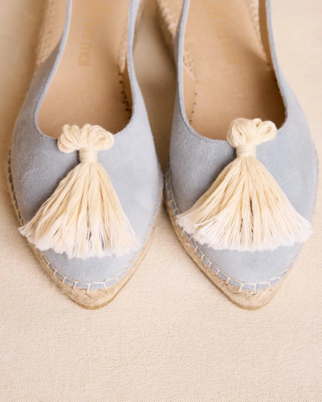 Espadrilles bleu clair avec pompons décoratifs. Design à bride arrière, confortable et avec une touche bohème.