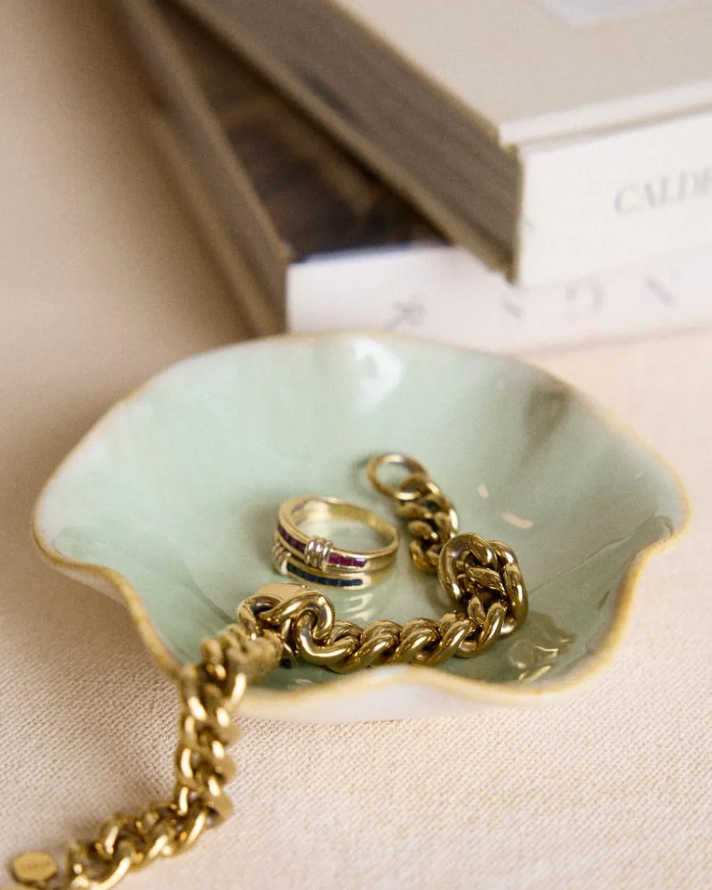 Plateau à bijoux en céramique de couleur menthe avec bord doré, design élégant et taille idéale pour les bagues, les bracelets et les petits accessoires.