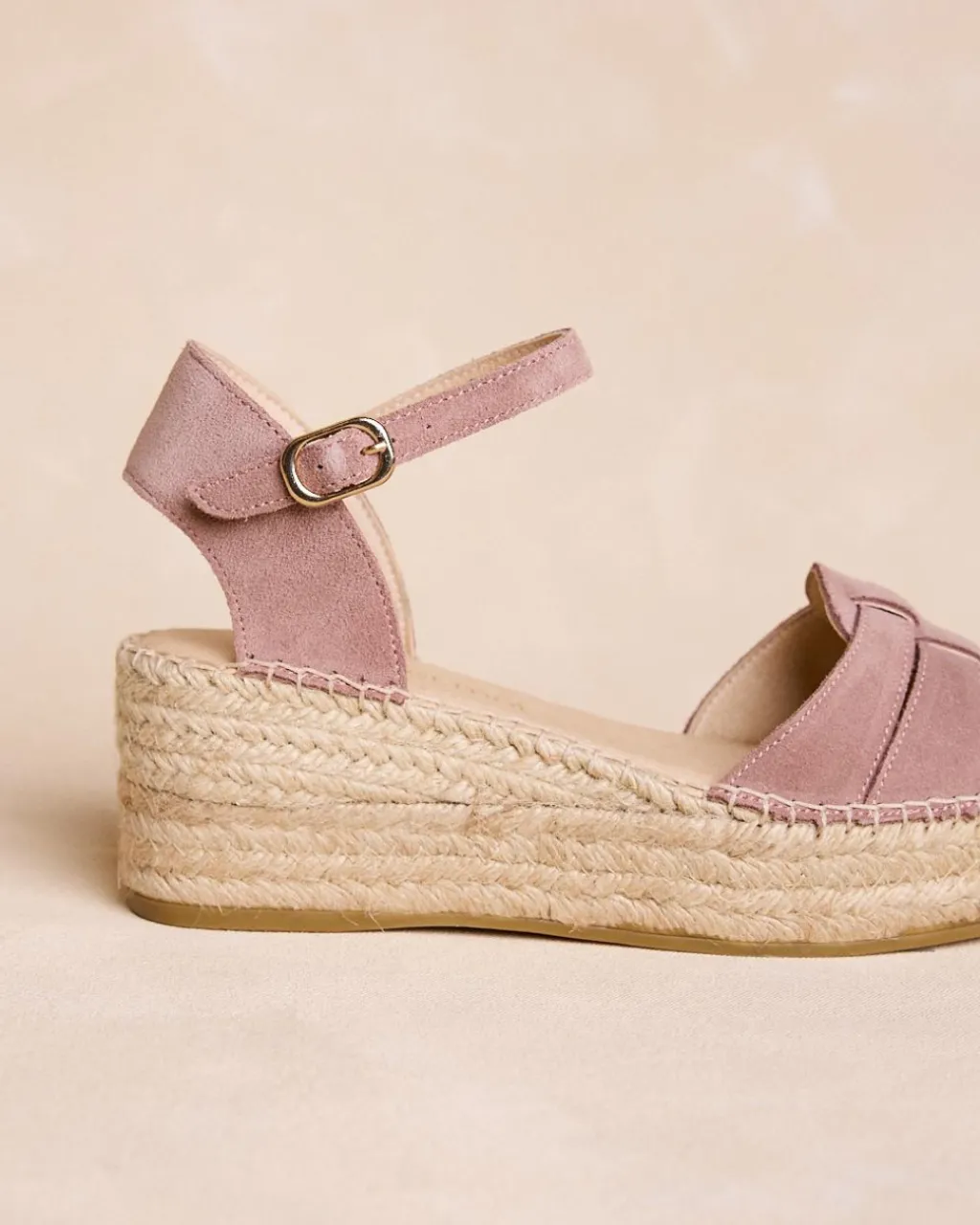 Espadrilles compensées de couleur taupe, design avec bretelles entrelacées à l’avant, fermeture à boucle et semelle en alfa.