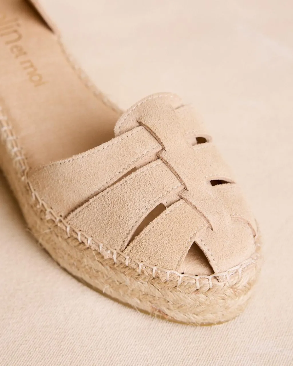 Espadrilles compensées en sable, design avec bretelles entrelacées à l’avant, fermeture à boucle et semelle en alfa.