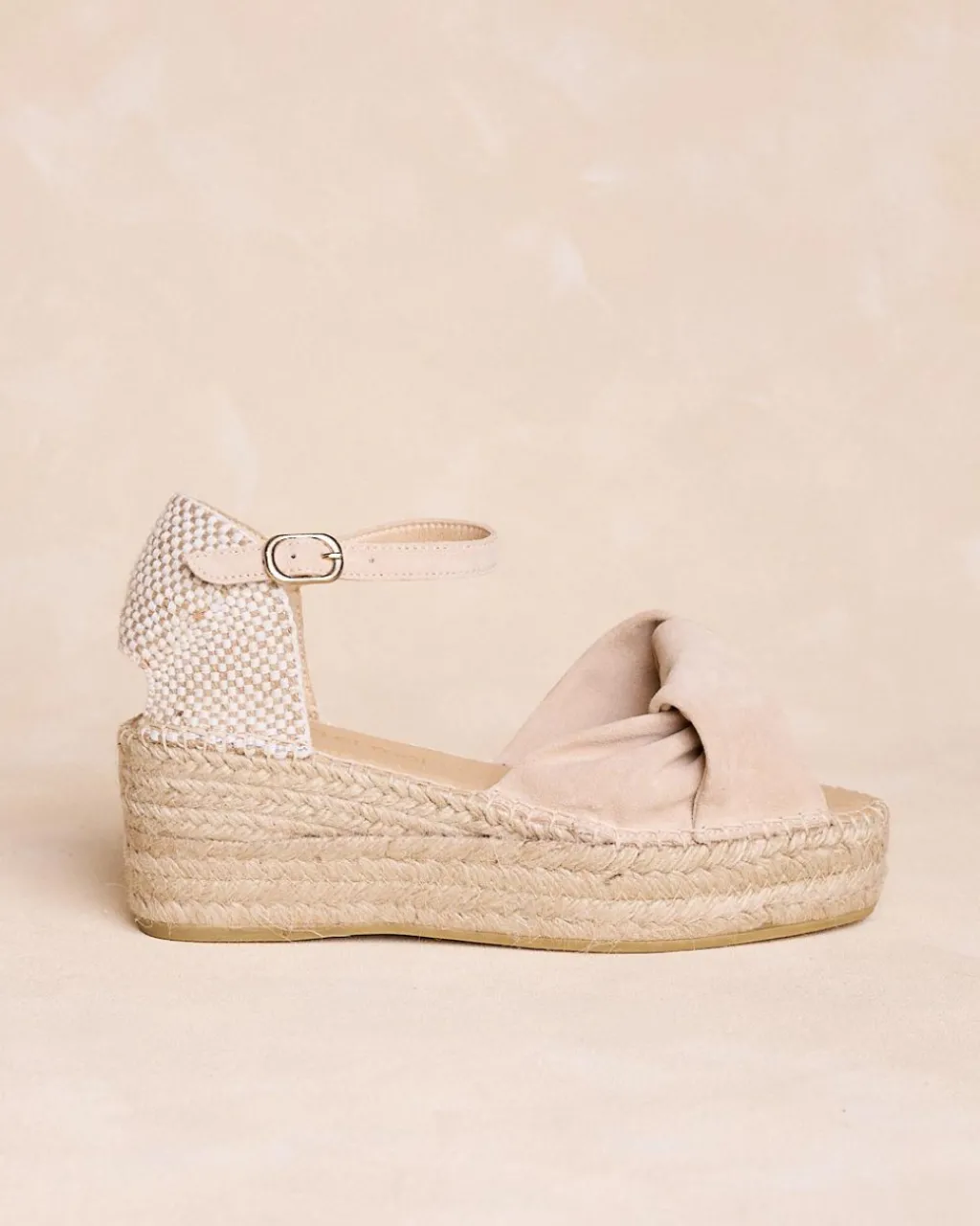 Espadrilles de couleur sable avec talon compensé en jute et nœud sur la tige. Leur conception avec une bride de cheville réglable en fait la chaussure idéale pour un look féminin et stylisé.