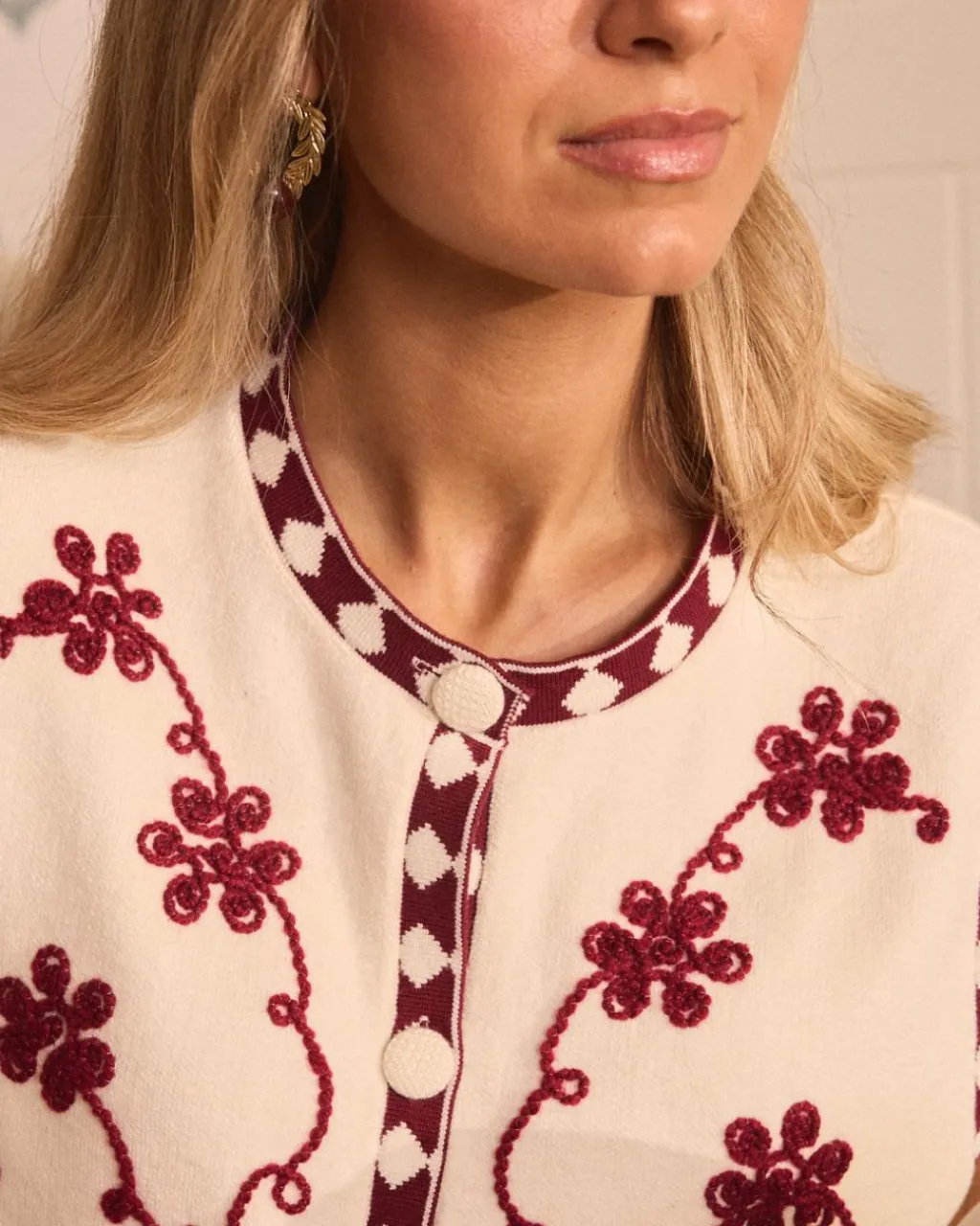 Gilet de couleur brute avec détails brodés de couleur carreau. Parfait pour rehausser vos looks de tous les jours.