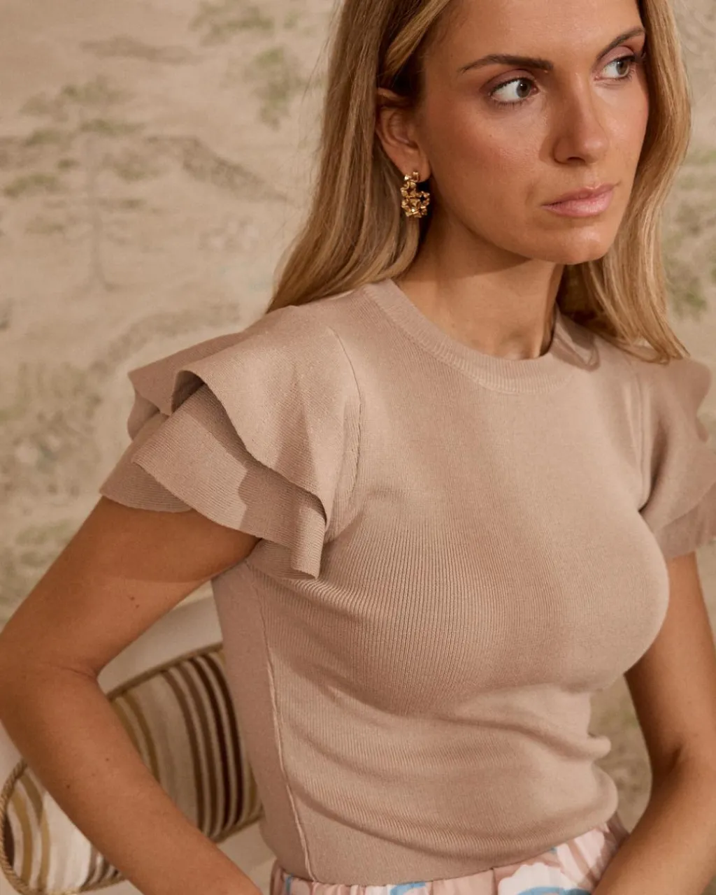 Haut en maille à la coupe ajustée et élégant dans un ton beige. Ses manches à volants ajoutent une touche sophistiquée et féminine. Polyvalente et facile à combiner avec des jupes ou des pantalons pour un look chic et intemporel.