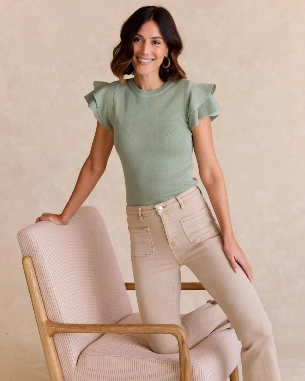 Haut à manches courtes vert eucalyptus avec volants sur les épaules, idéal pour un style décontracté mais avec une touche distinctive.