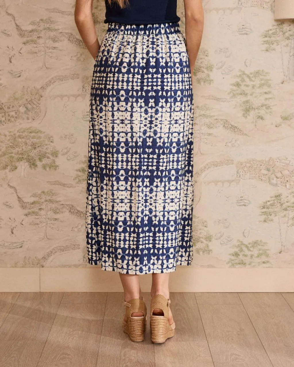 Jupe midi en dégradé imprimer dans les tons bleu et blanc.