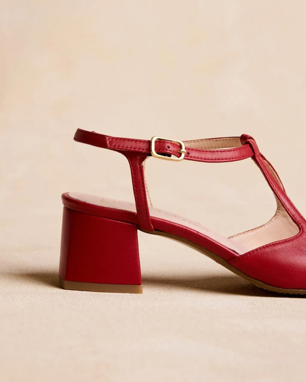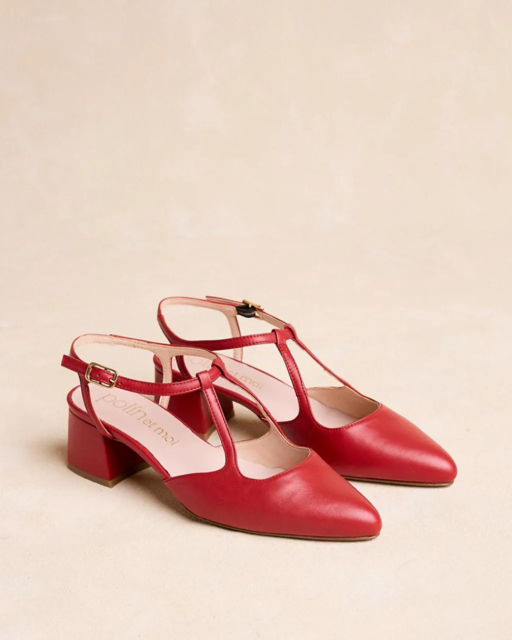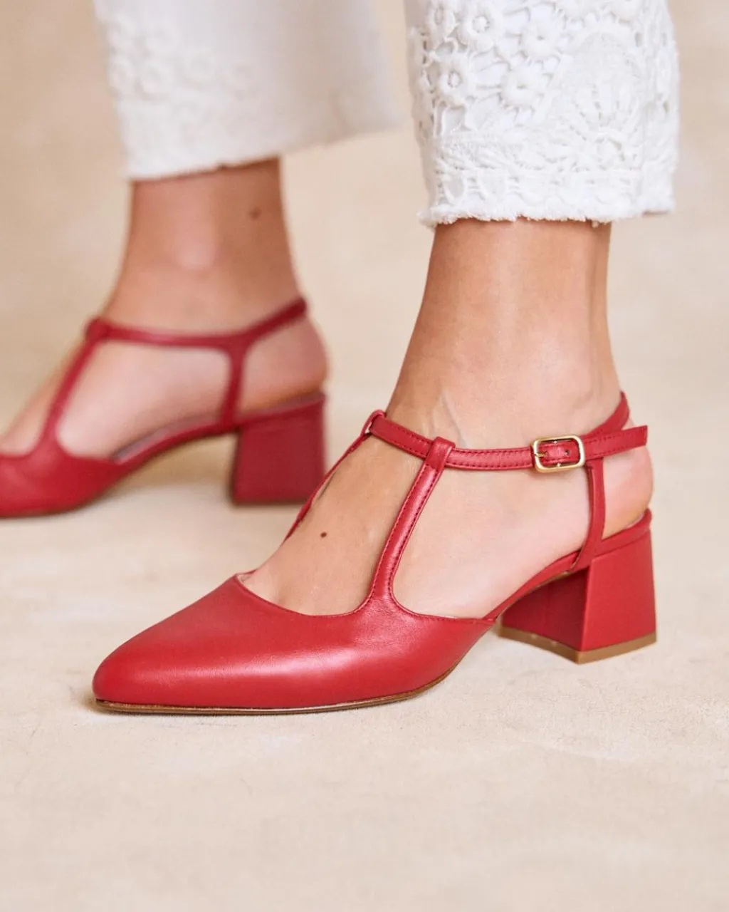 Chaussure rouge à dos ouvert. Bout fermé avec une prononciation pointue, mais se terminant arrondi. Détail des bretelles sur le cou-de-pied. Fermeture de la cheville par sangle réglable avec boucle carrée. Talon bas et carré avec une finition dans le même ton que le reste de la chaussure.