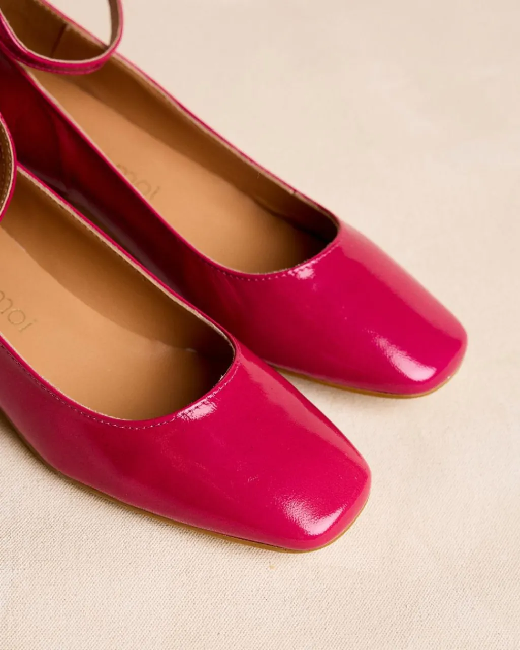 Mary Jane en framboise. Pointe pointue légèrement arrondie. Encolure fermée. Fermeture de la cheville par sangle réglable avec boucle carrée. Talon large. Une chaussure très féminine et confortable.