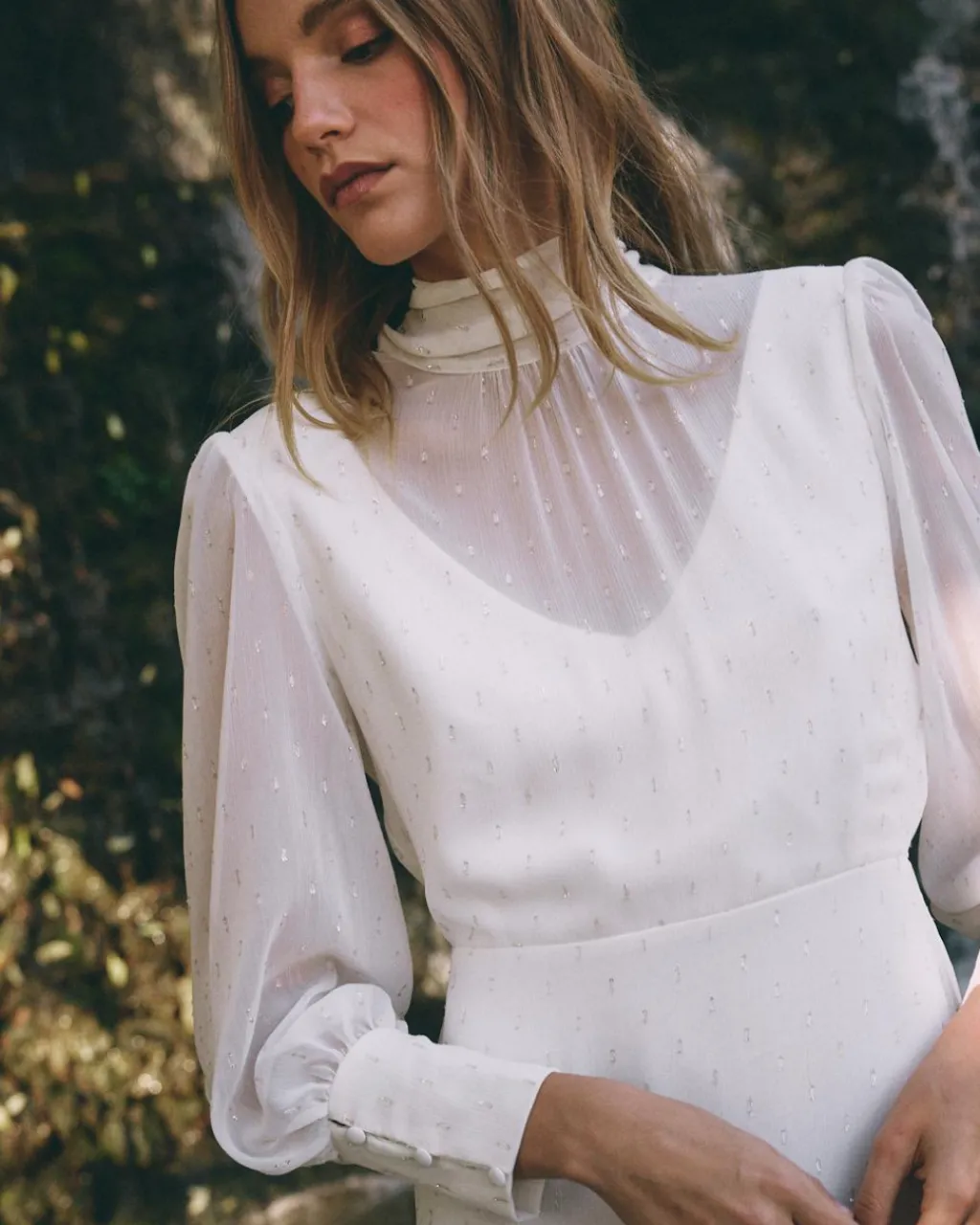 Robe longue mariée blanche. Fabriqué dans un tissu léger, ce modèle présente une encolure ronde avec des plis doux qui mettent en valeur la zone du cou. Les manches longues en mousseline de soie avec du lurex plumeti ajoutent une touche de délicatesse et de légèreté à la tenue. La silhouette droite et fluide stylise la silhouette, étant un choix idéal pour mariée recherchent la simplicité et l’élégance.