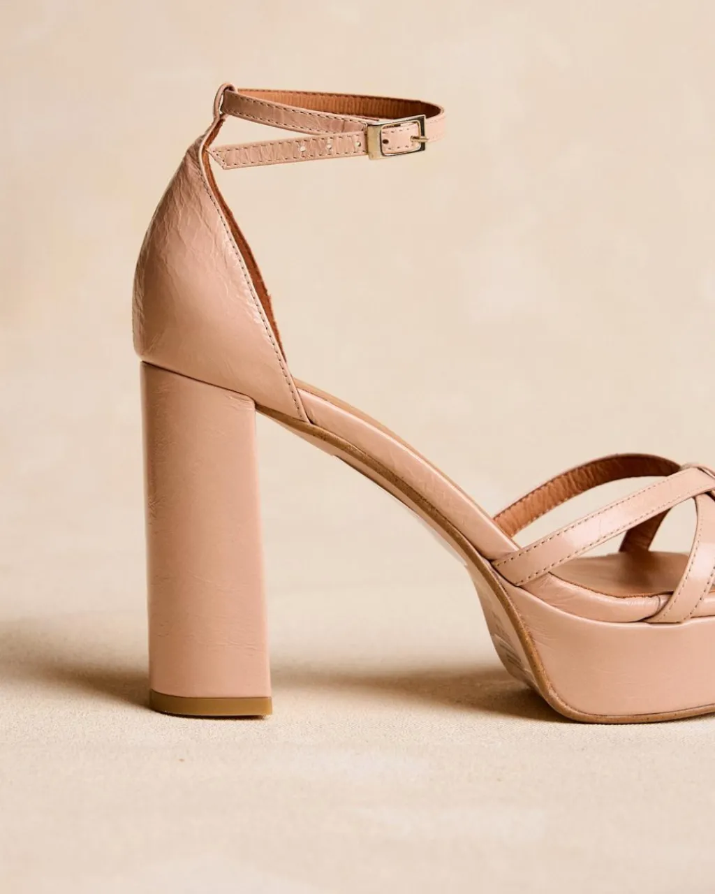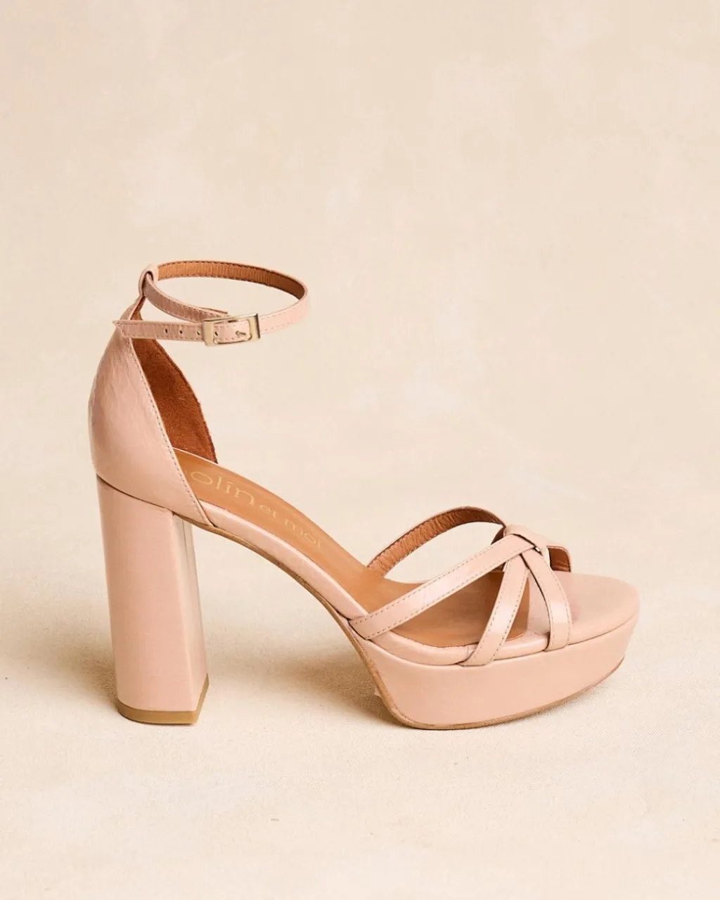 Sandale à talons arrière de couleur nude avec plusieurs rubans qui se croisent. Pointe arrondie. Fermeture de la cheville par sangle réglable avec boucle carrée. Talon large et plateforme pour plus de confort. Une chaussure très féminine et élégante pour le evénements de cette saison.