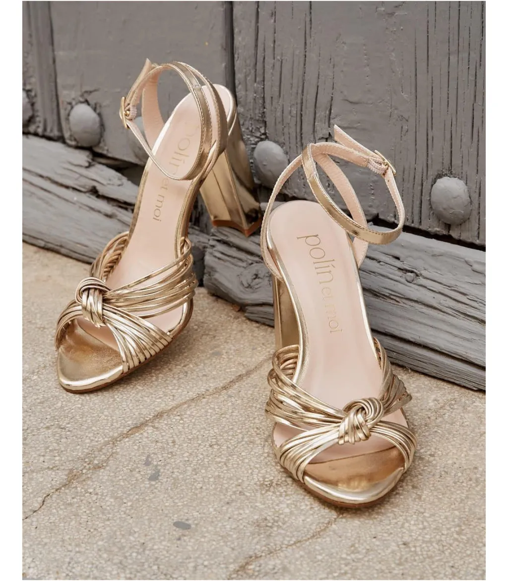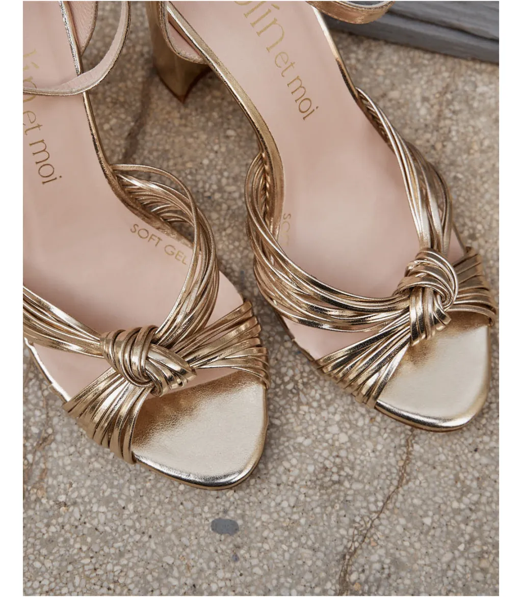Sandale avec brides sur le cou-de-pied et nœud de couleur or. Conception à plusieurs bretelles assortie sur le cou-de-pied avec un nœud au centre. Pointe légèrement carrée. Fermeture de la cheville par sangle réglable avec boucle carrée. Talon large pour plus de confort. Une chaussure très féminine et élégante pour le evénements de cette saison.