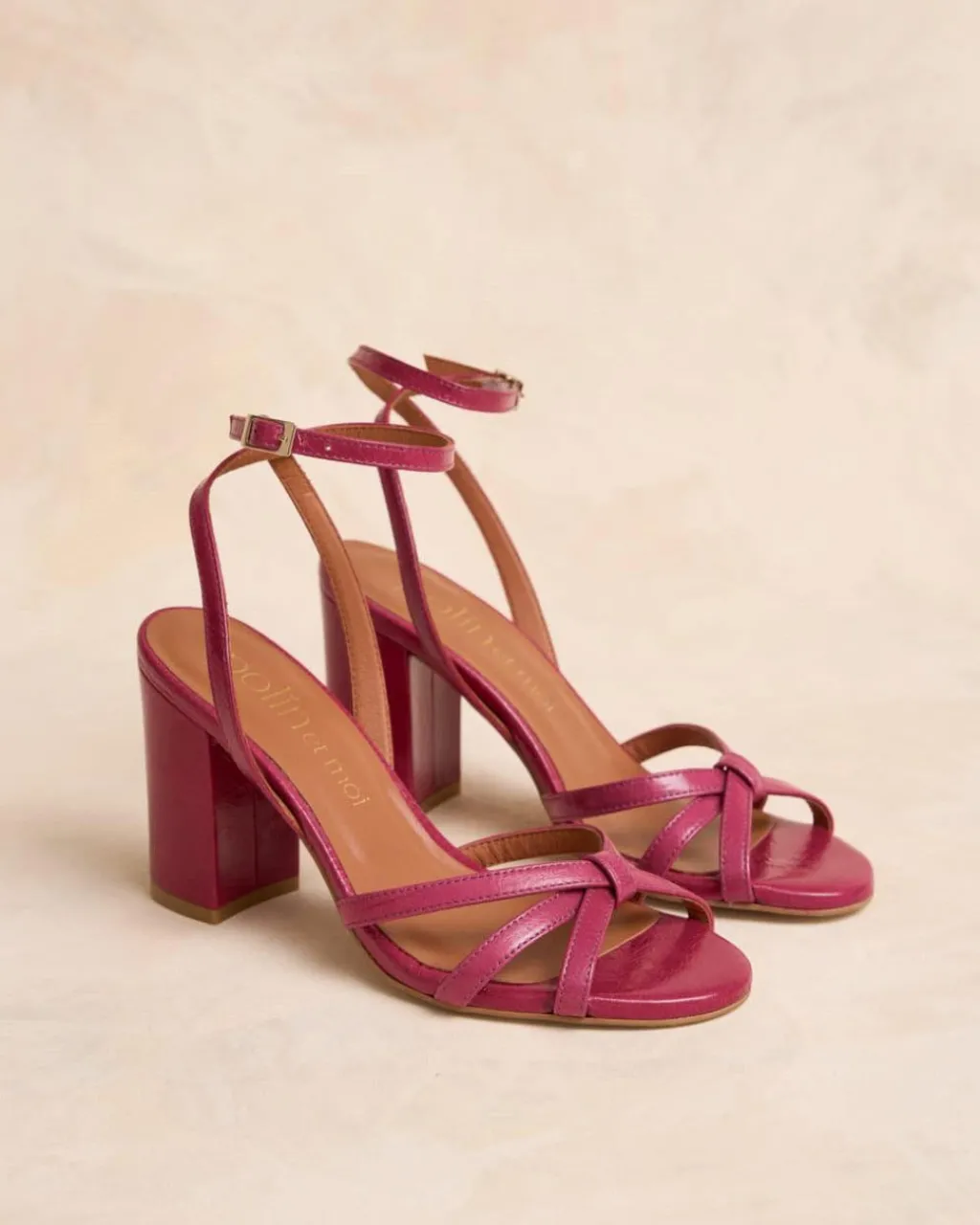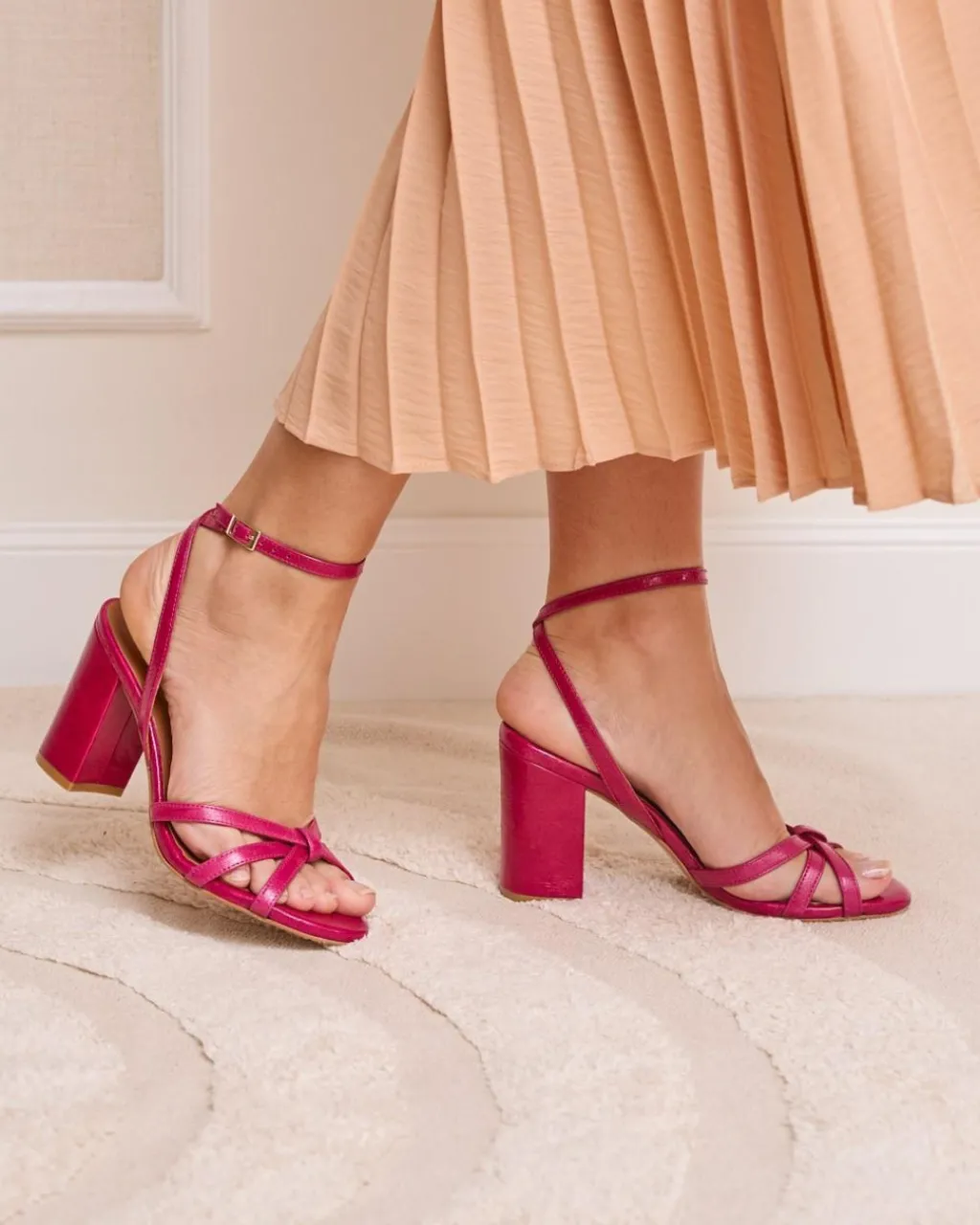 Sandale à talons de couleur bougainvillière avec plusieurs rubans qui se croisent en formant un nœud au centre. Pointe arrondie. Fermeture de la cheville par sangle réglable avec boucle carrée. Talon large pour plus de confort. Une chaussure très féminine et élégante pour le evénements de cette saison.