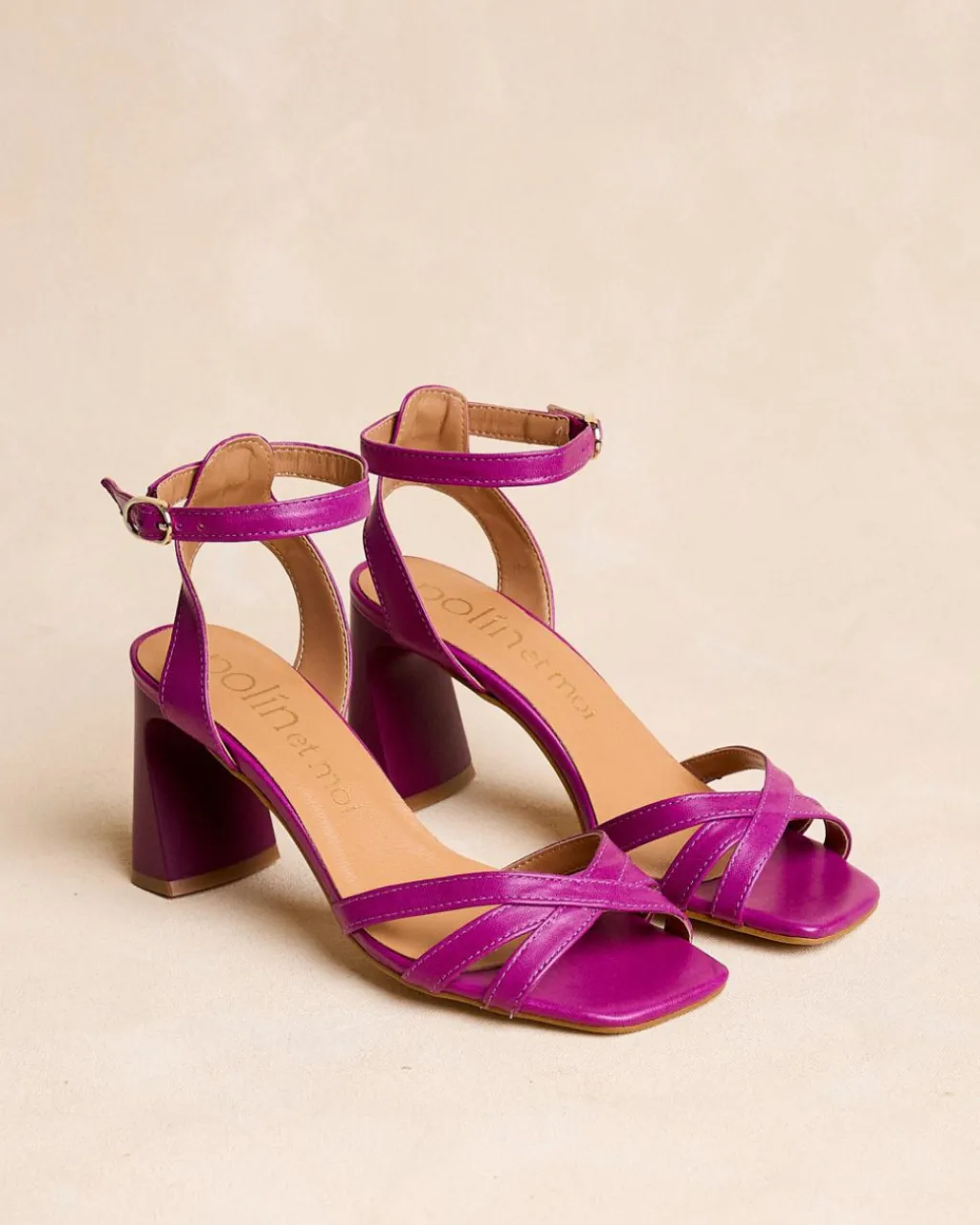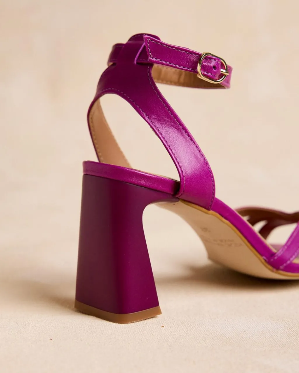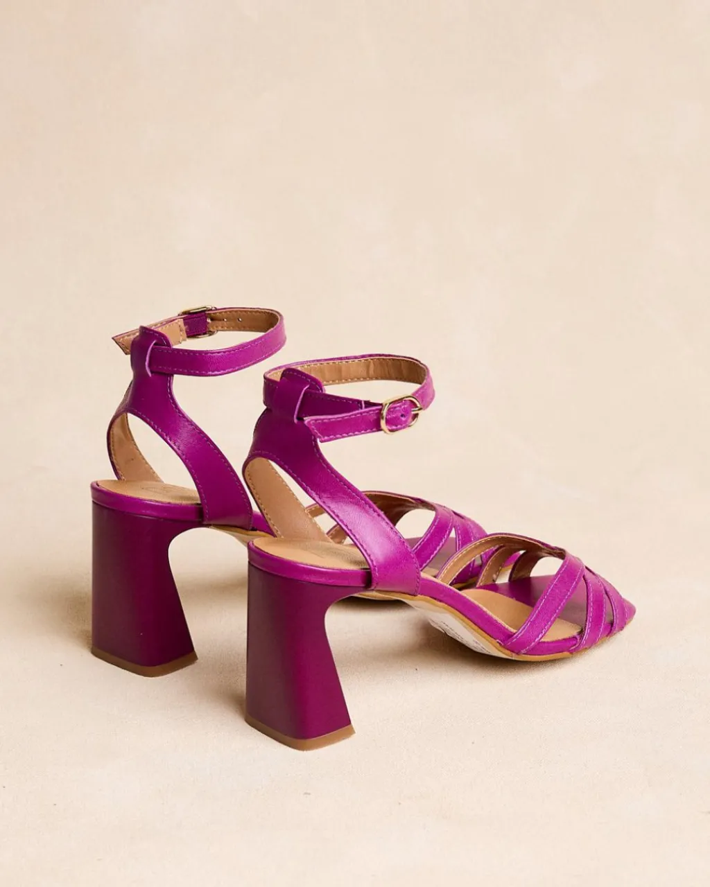 Sandale à talons couleur bougainvillier. Pointe carrée aux coins légèrement arrondis. Encolure avec trois rubans croisés. Fermeture de la cheville par sangle réglable avec boucle carrée. Une chaussure élégante et confortable.