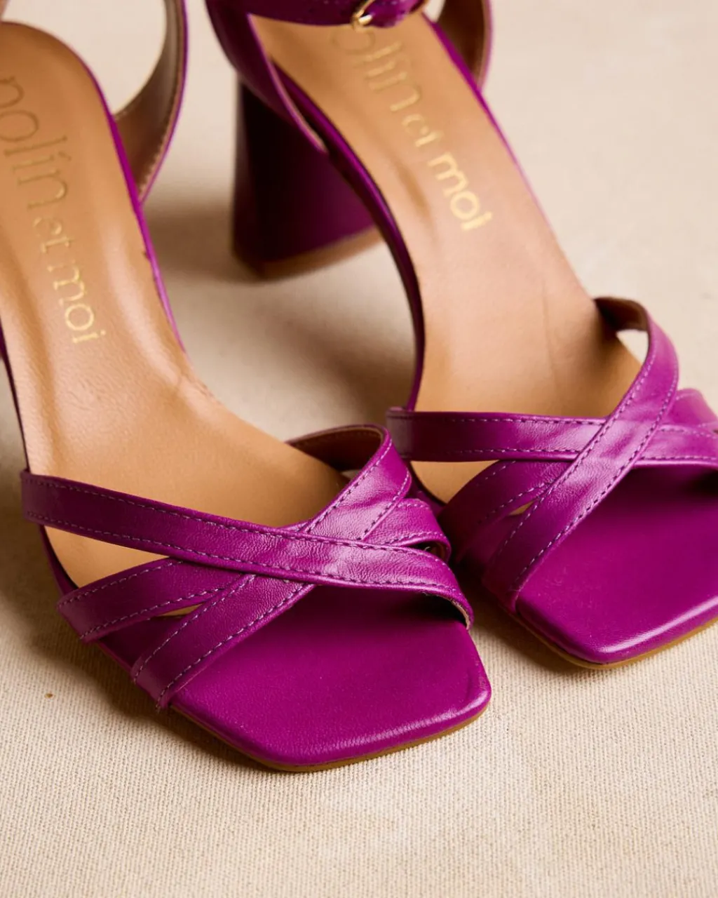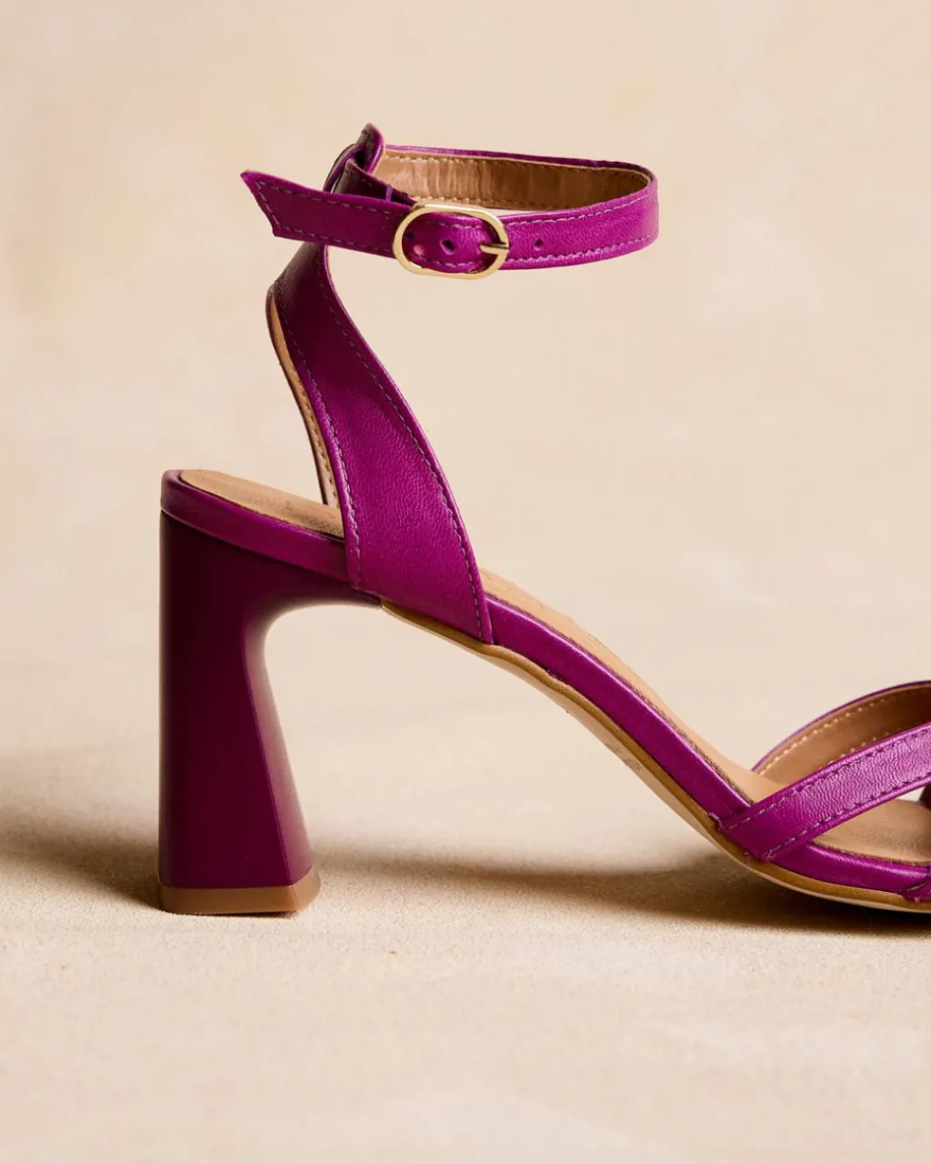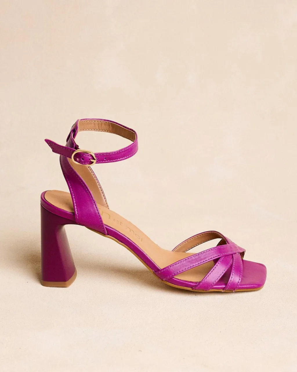 Sandale à talons couleur bougainvillier. Pointe carrée aux coins légèrement arrondis. Encolure avec trois rubans croisés. Fermeture de la cheville par sangle réglable avec boucle carrée. Une chaussure élégante et confortable.