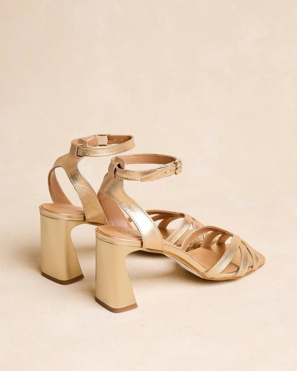 Sandale à talons dorés. Pointe carrée aux coins légèrement arrondis. Encolure avec trois rubans croisés. Fermeture de la cheville par sangle réglable avec boucle carrée. Une chaussure élégante et confortable.