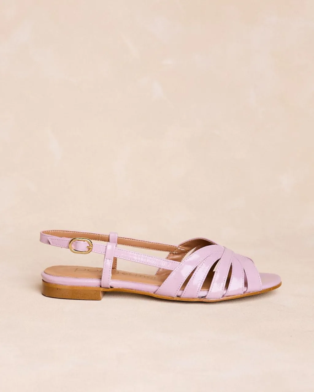 Sandale en cuir mauve. Design avec sangles entrelacées et bracelet ajustable avec boucle dorée. Son bout légèrement arrondi et sa semelle plate en font une option confortable et élégante à tout moment de la journée.
