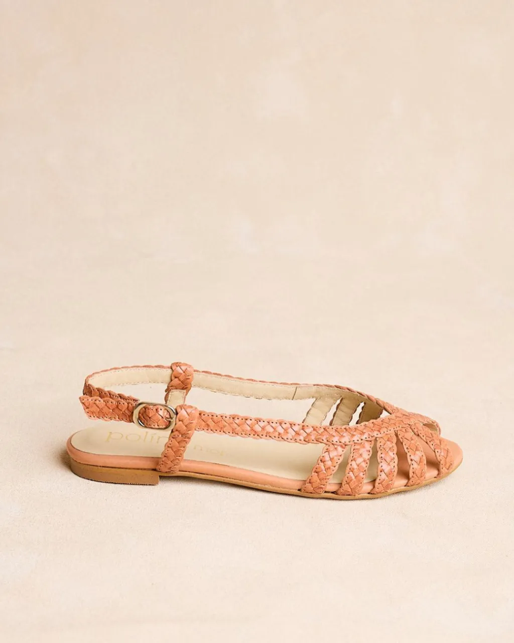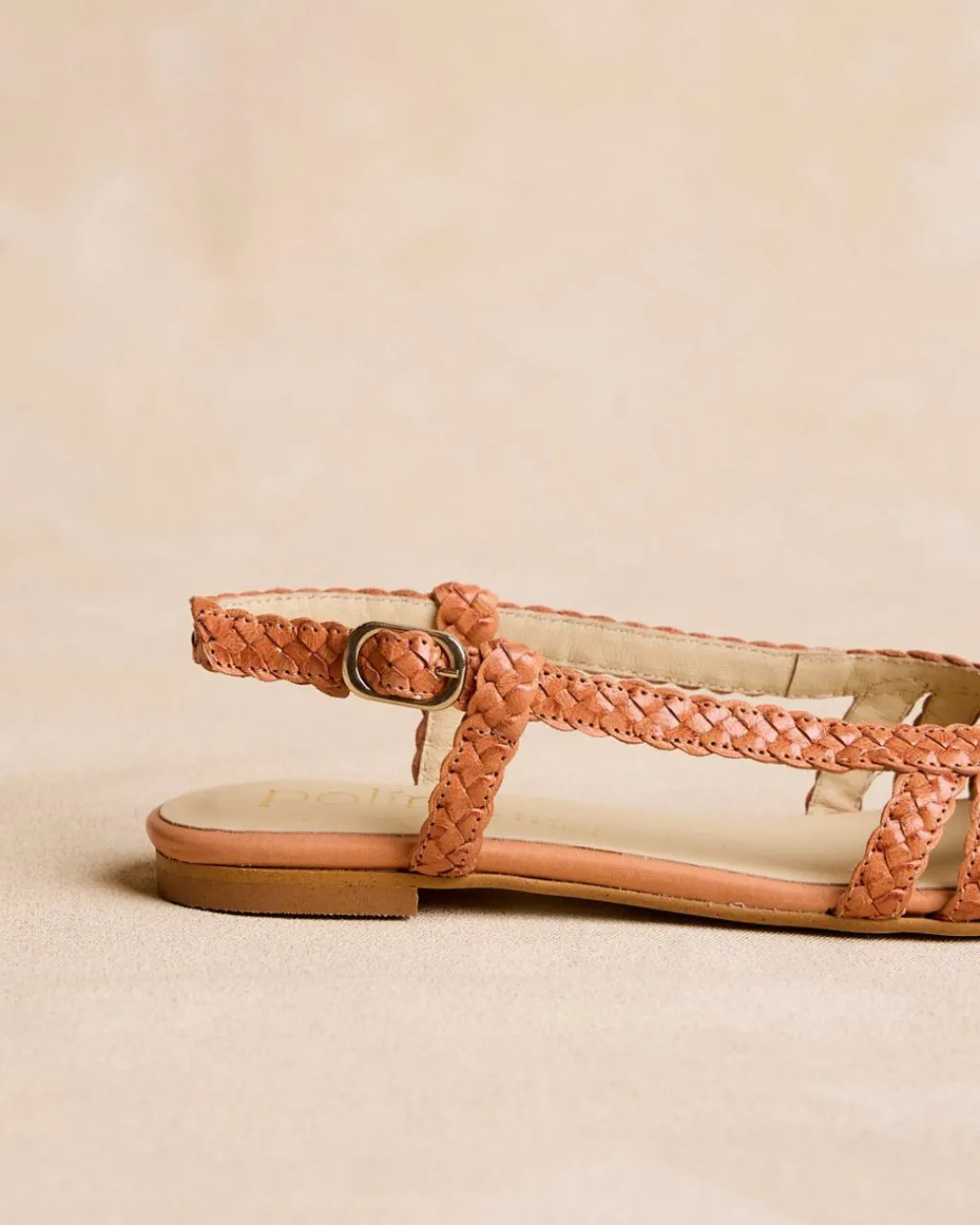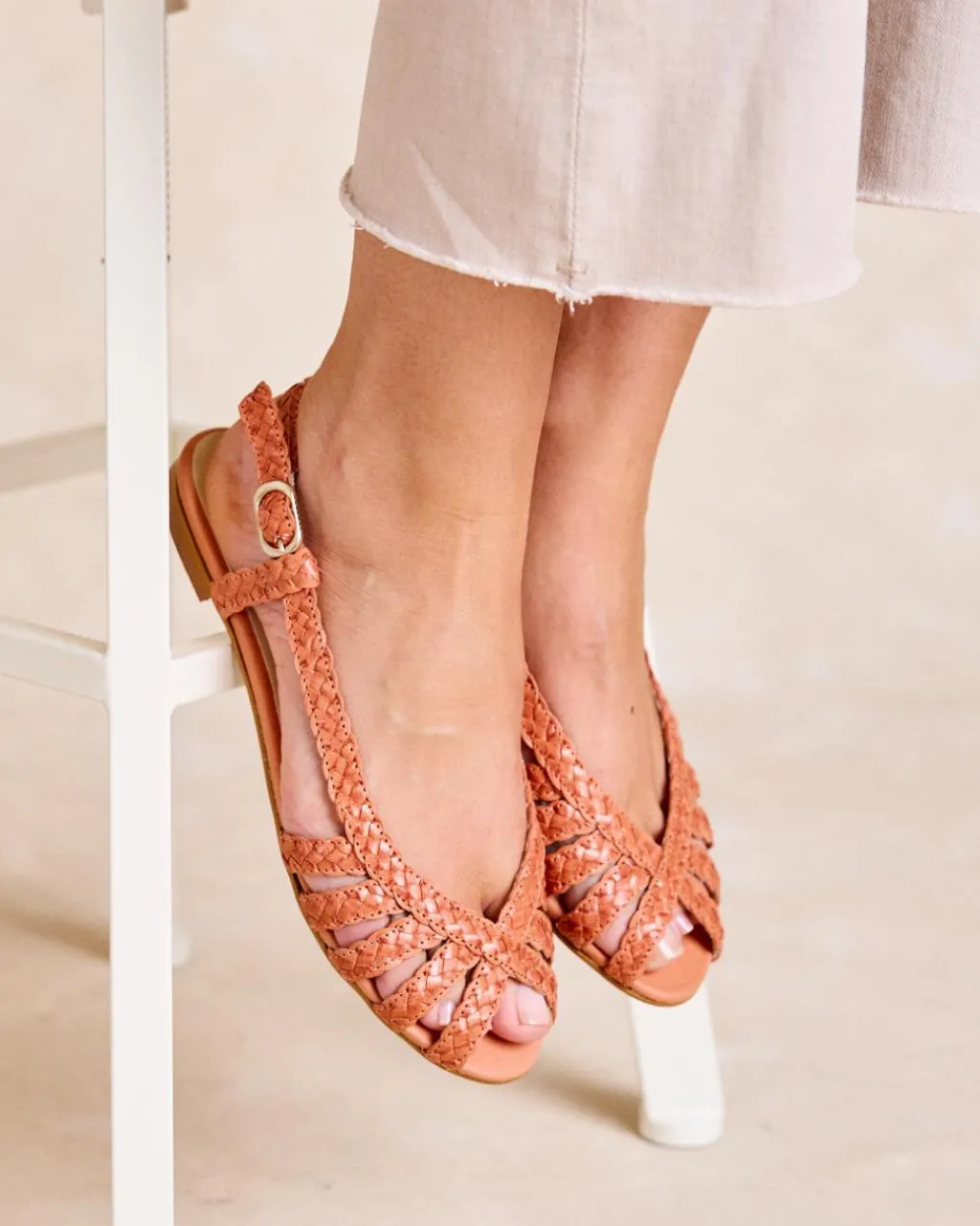 Sandale plate en cuir tressé orange. Bout ouvert et pointu. Ouvertures sur le cou-de-pied avec lanières en cuir tressé. Support de cheville avec fines sangles à boucle. La semelle intérieure est dotée d’un coussinet pour plus de confort. Une sandale pour rehausser n’importe quel look cette saison.