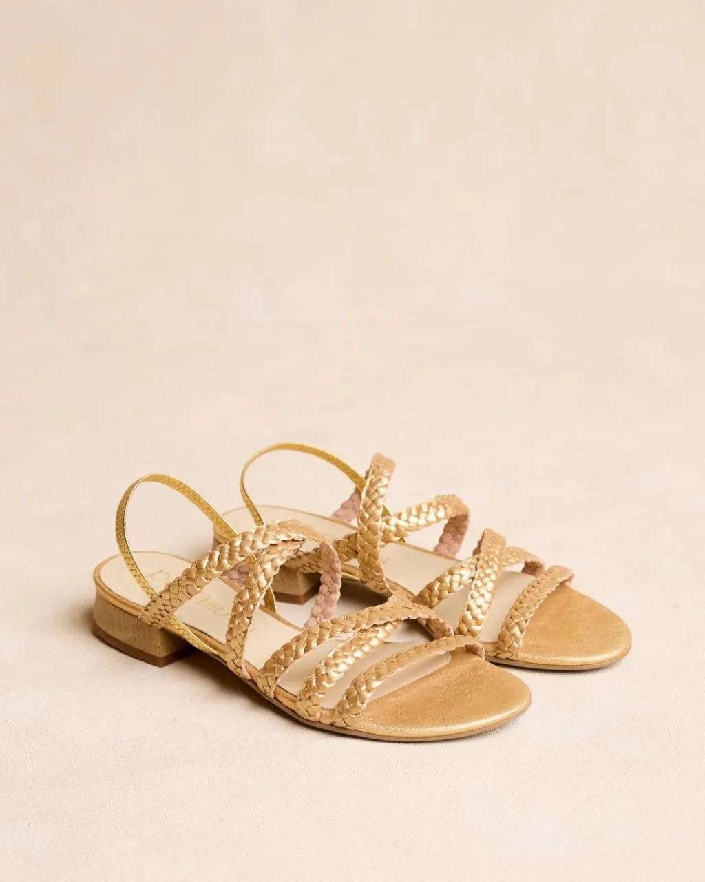 Sandale en cuir tressé doré. Encolure avec rubans tressés croisés en orange, blanc et camel. Talon fermé par une bride en cuir élastique de couleur camel pour un ajustement confortable. Une sandale aux couleurs très spéciales et polyvalentes pour cette saison.