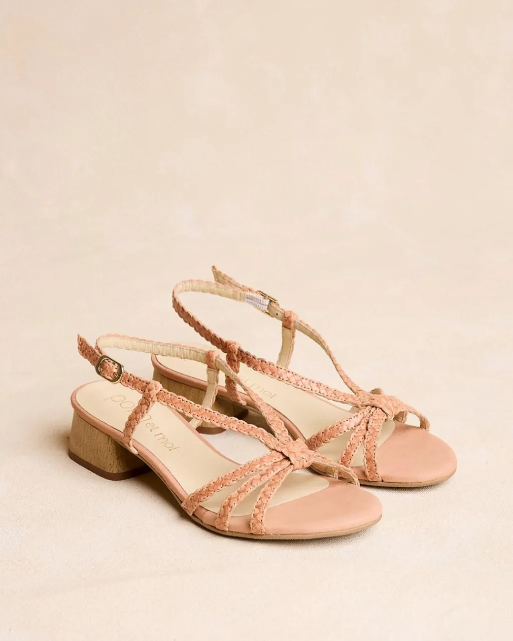 Sandale à talon tressé en cuir camel. Tige en ruban triple tressé avec détail de nœud au centre. Talon fermé par une bride en cuir avec boucle pour un meilleur ajustement. Petit talon carré effet bois. Une sandale confortable et très polyvalente à porter au quotidien.