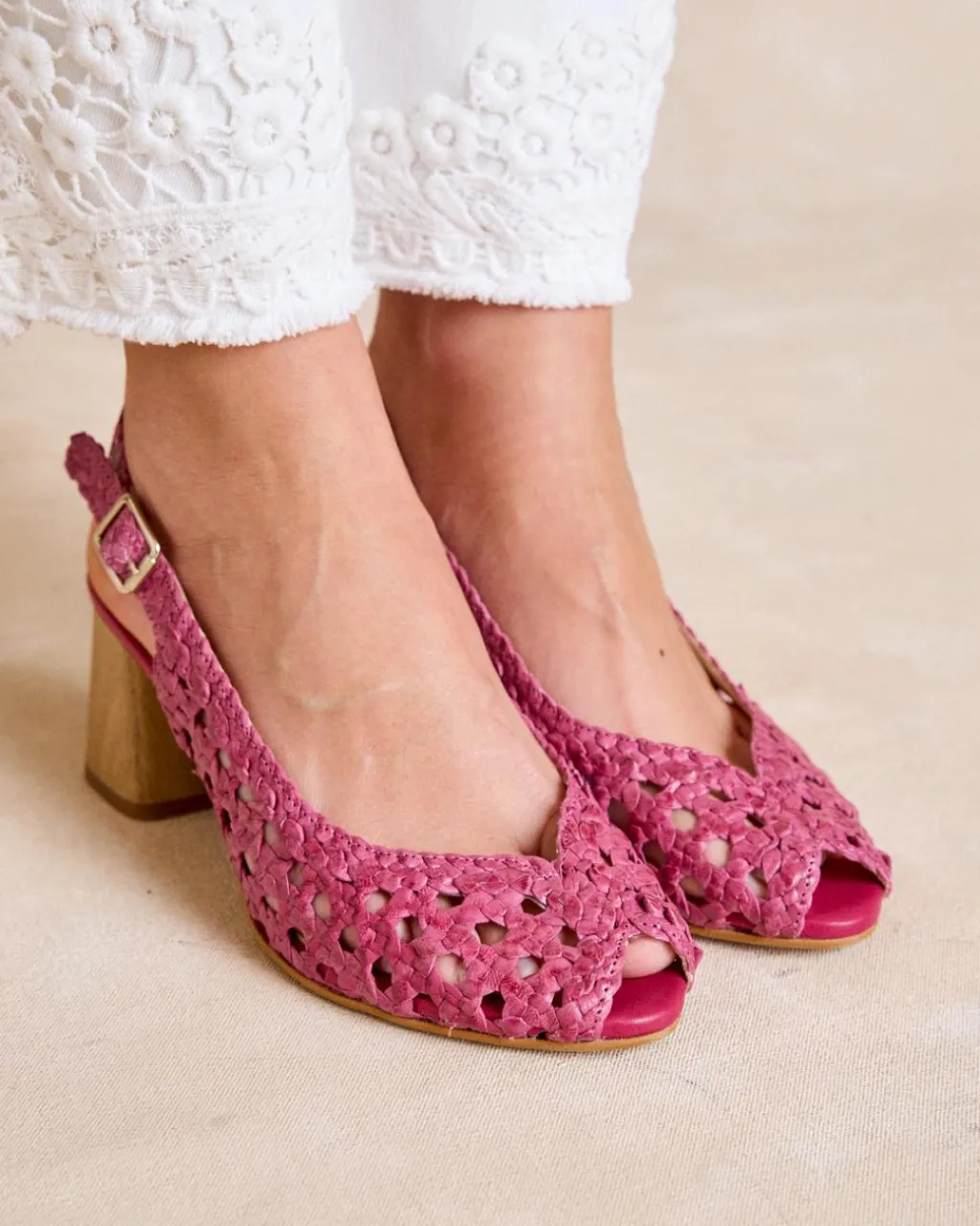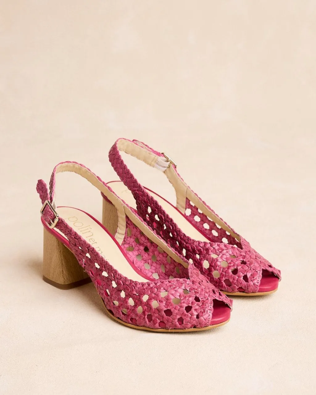 Chaussure à talon en cuir avec finition tressée de couleur framboise. Décolleté subtil en forme de cœur. Bout légèrement carré avec une petite ouverture. Fermeture du talon par une bride tressée avec boucle pour un ajustement confortable. Talon avec finition bois. C’est une chaussure idéale et confortable à combiner cette saison avec vos vêtements préférés.