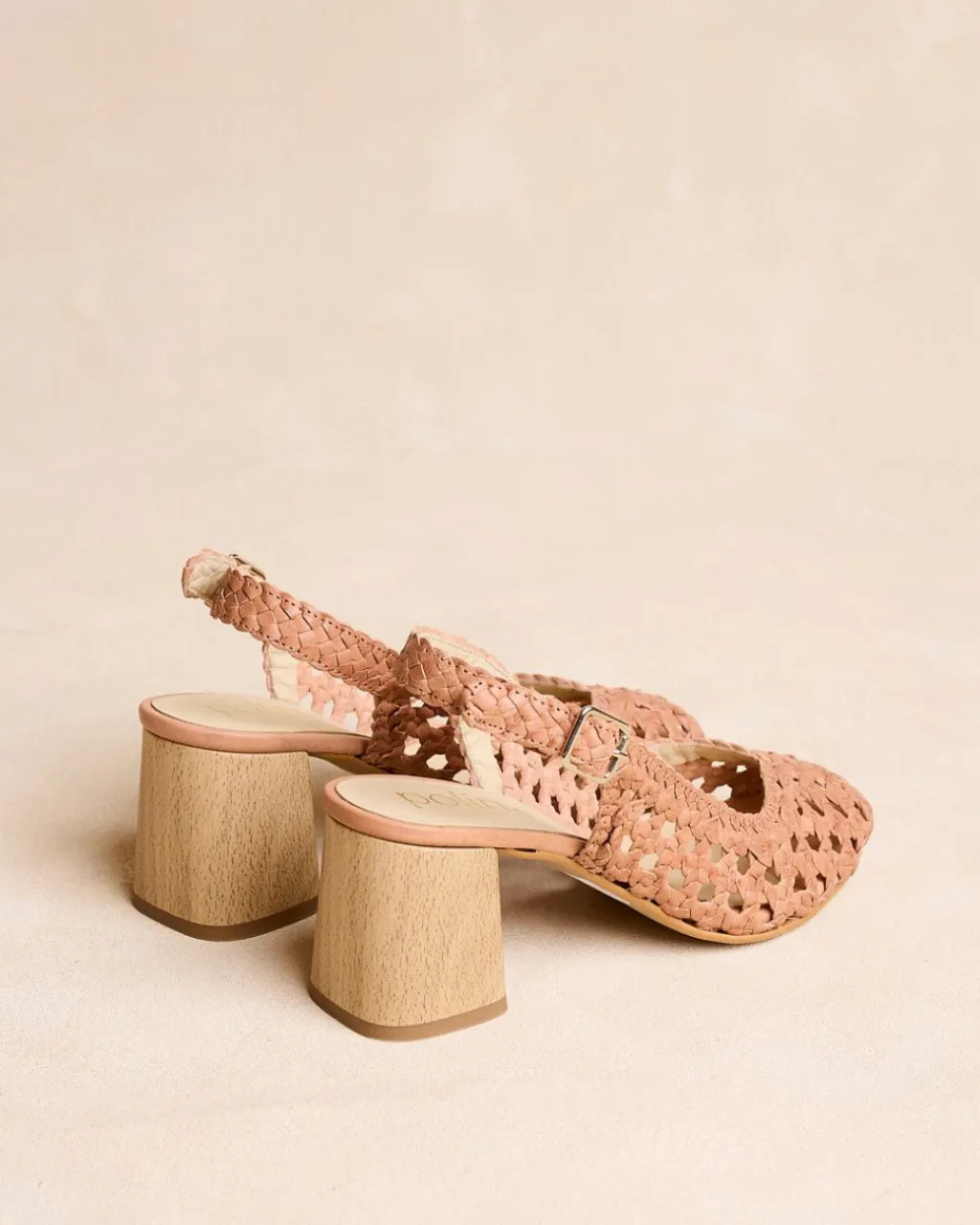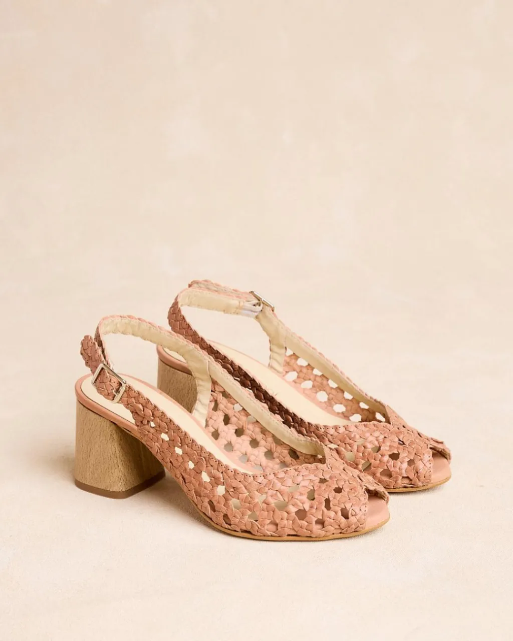 Chaussure à talon en cuir avec finition tressée de couleur ocre. Décolleté subtil en forme de cœur. Bout légèrement carré avec une petite ouverture. Fermeture du talon par une bride tressée avec boucle pour un ajustement confortable. Talon avec finition bois. C’est une chaussure idéale et confortable à combiner cette saison avec vos vêtements préférés.